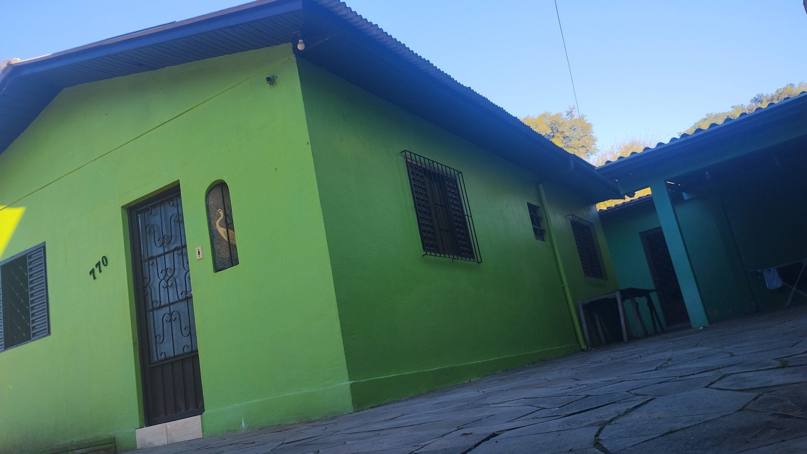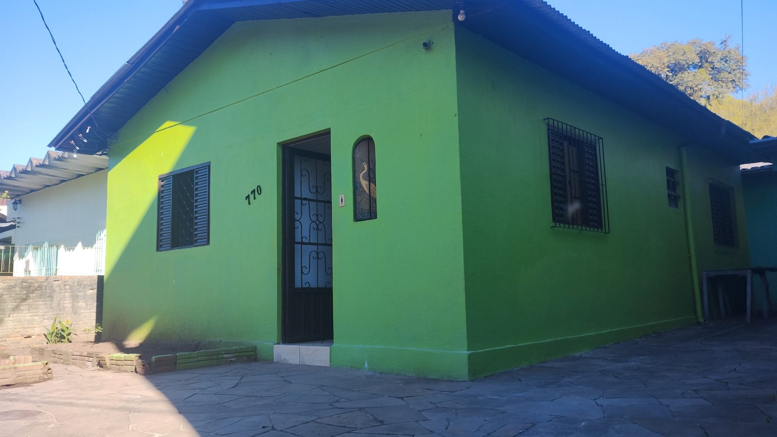 A casa da frente com garagem.